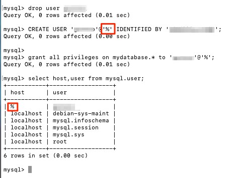 mysql> grant all privileges on mydatabase.* to 'ユーザー名'@'%';