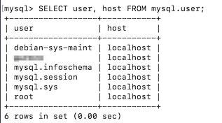 mysql>過去に作成したユーザーはホストがlocalhostなので、外部から参照できるようにホストを % に変更します。ホストを%にすると、どのホストからも接続できるようになります。(下記のコマンド例における「ユーザー名」「パスワード」は、実際に作成したユーザー名とパスワードに置き換えて実行してください)