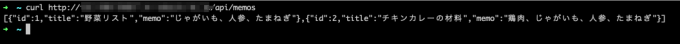 [{"id":1,"title":"野菜リスト","memo":"じゃがいも、人参、たまねぎ"},{"id":2,"title":"チキンカレーの材料","memo":"鶏肉、じゃがいも、人参、たまねぎ"}]