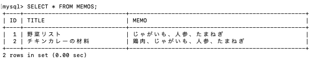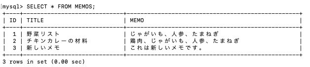 $ curl -X POST -H "Content-Type: application/json" -d '{"id":0,"title":"新しいメモ","memo":"これは新しいメモです。"}' http://ホスト名/api/memosその後、MySQLにてSELECT文を実行すると、新しいデータが追加されていることがわかります。