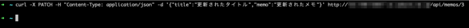 $ curl -X PATCH -H "Content-Type: application/json" -d '{"title":"更新されたタイトル","memo":"更新されたメモ"}' http://ホスト名/api/memos/3その後、SELECT文を実行すると、3番目のデータの内容が変更されていることがわかります。