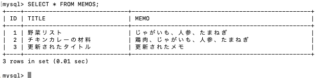 |  3 | 更新されたタイトル             | 更新されたメモ                                     |