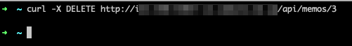 最後にデータの削除です。こちらはDETELEメソッドを使用します。以下のcurlコマンドを実行します。