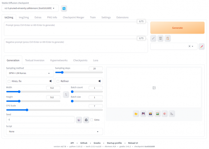 ログインすると、次のような画面が表示されます。(画面はStable Diffusion WebUIのアップデートによって変更になっている場合があります)