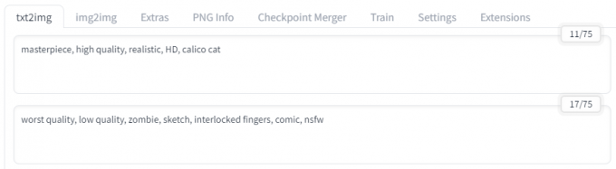 txt2imgタブのPromptとNegative promptに生成内容を指定して何か生成してみましょう。2つある入力欄の、上がPrompt、下がNegative promptです。