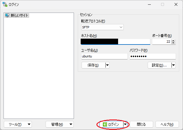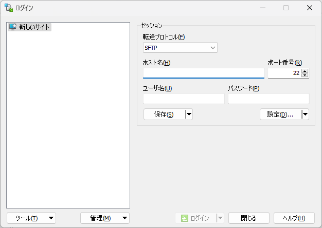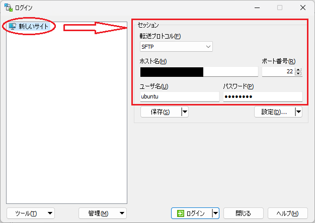 ログインダイアログが開いたら、「新しいサイト」をクリックし、右側に接続情報を設定します。
