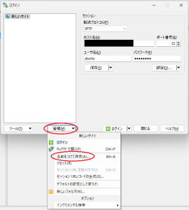 ログインダイアログを閉じてしまった場合や、設定によって開かない場合は、メニューの「タブ」→「新しいタブ」または「タブ」→「サイト」→「サイトマネージャー…」を選択してください。