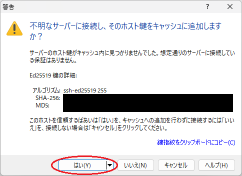 初めて接続するサーバの場合、接続先のサーバに関する接続が表示されます。本来は内容をきちんと確認するべきですが、「はい」をクリックします。2回目以降に接続する場合でこの表示が行われた場合は間違ったサーバーに接続しようとしているなど何かおかしいので「キャンセル」してください。