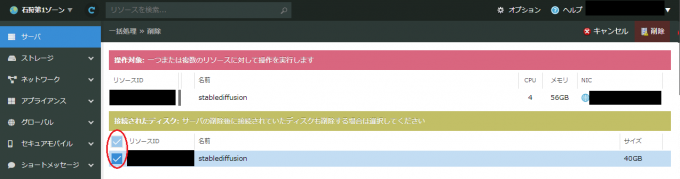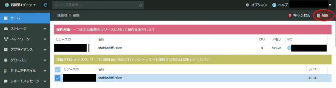 サーバの「電源操作」が「DOWN」になったら、右上から「サーバを削除」をクリックします。