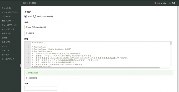 さくらのクラウドには、新たにサーバを作成する際にスクリプトを実行することで、使いたいソフトウェアのインストールや設定を行うことができる「スタートアップスクリプト」という機能があります。今回の作業ではこれを使って、Stable Diffusion WebUIの構築に必要なインストールや設定を行います。