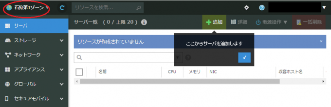 サイドバーの「サーバ」をクリックして、サーバ一覧を開きます。