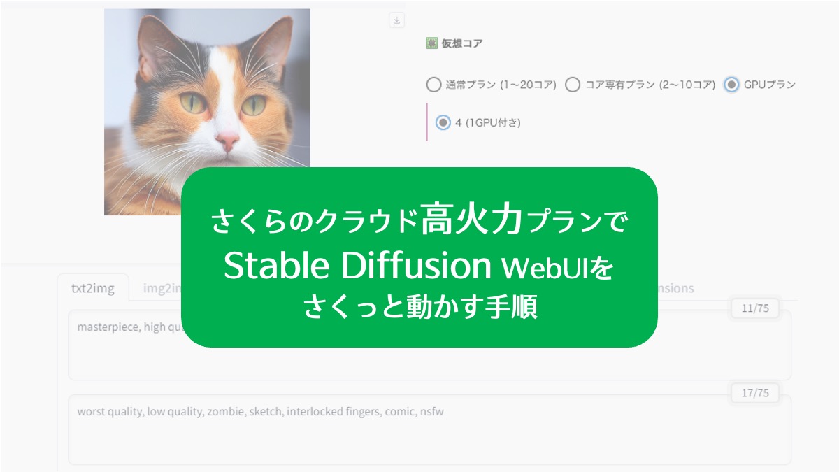本記事では、GPUサーバを使って画像生成AIを利用してみたいという方に向けて、代表的な画像生成AIモデルの1つであるStable Diffusion、およびそのWebUIを、さくらのクラウド高火力プランで動かす手順をご紹介します。