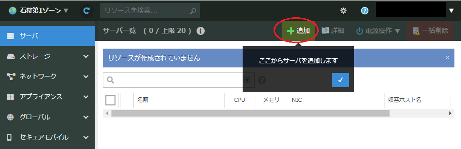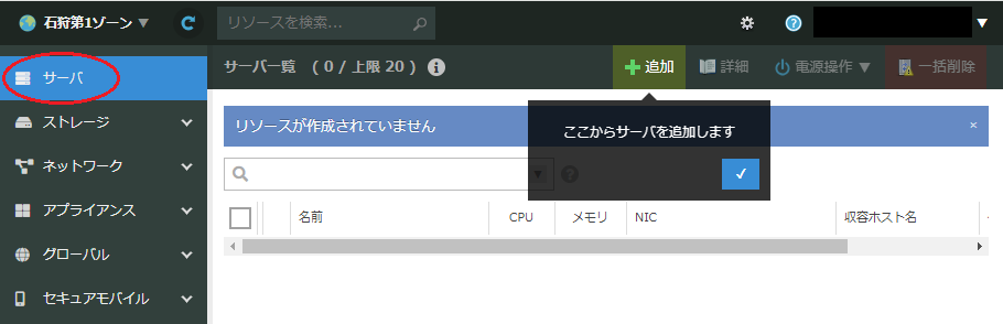 作成したサーバの行をダブルクリックするか、右端の「▼」をクリックして「詳細」を選択します。