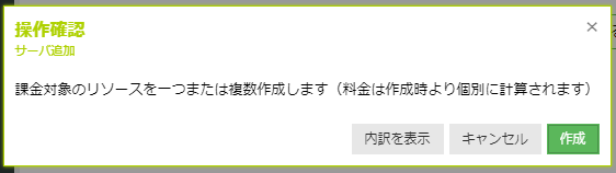 設定が完了したら「+ 作成」ボタンをクリックします。すると、有料リソースの作成確認ダイアログが表示されます。内容を確認して「作成」ボタンをクリックします。
