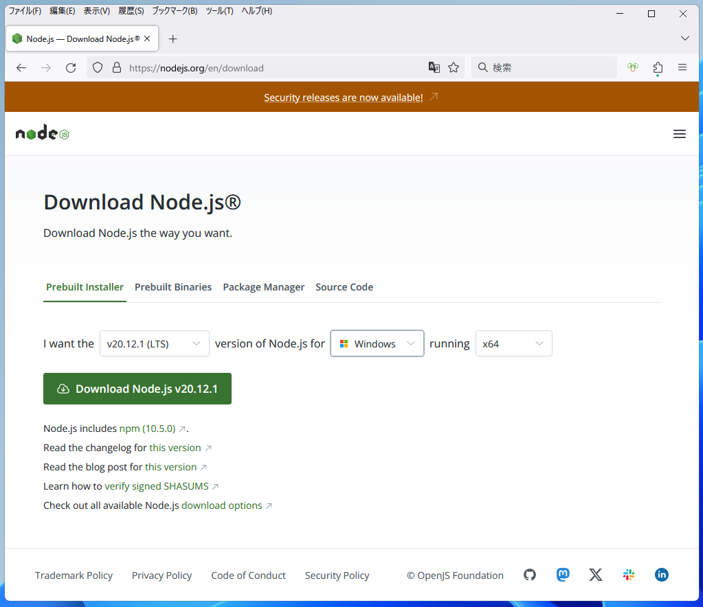 - Node.jsのバージョン: 現在表示されているバージョン(通常は最新版)