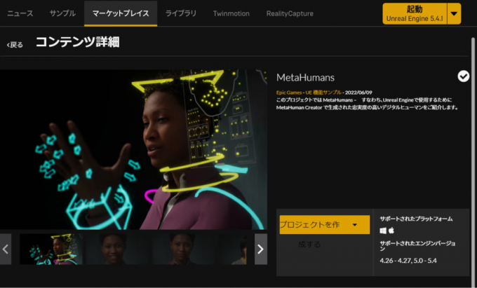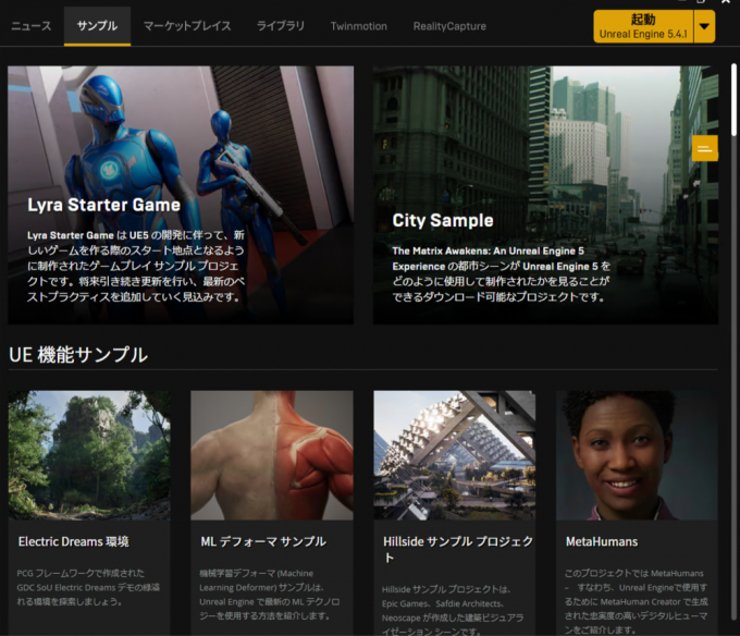 次にMetaHumanのサンプルをダウンロードしてプロジェクトを作成します。Launcherの「サンプル」タブをクリックし、上から2段目付近の「UE機能サンプル」の中にある「MetaHumans」というアイテムをクリックします。
