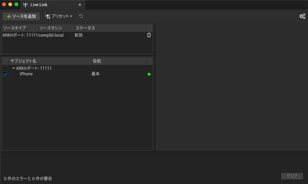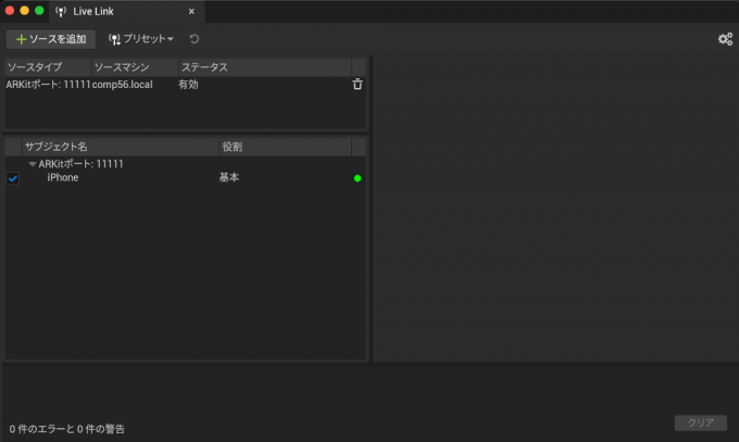 まず、Unreal Engineのメニューから「ウインドウ」-「バーチャルプロダクション」-「Live Link」をクリックします。「Live Link Face」アプリが立ち上がっていると自動的に検出してソースが追加されます。ポート番号「11111」を変更したい場合は「+ソースを追加」-「Apple ARKitソース」-「ポート」で他の値を指定します。緑の丸がついている場合はデータの受信に成功しています。