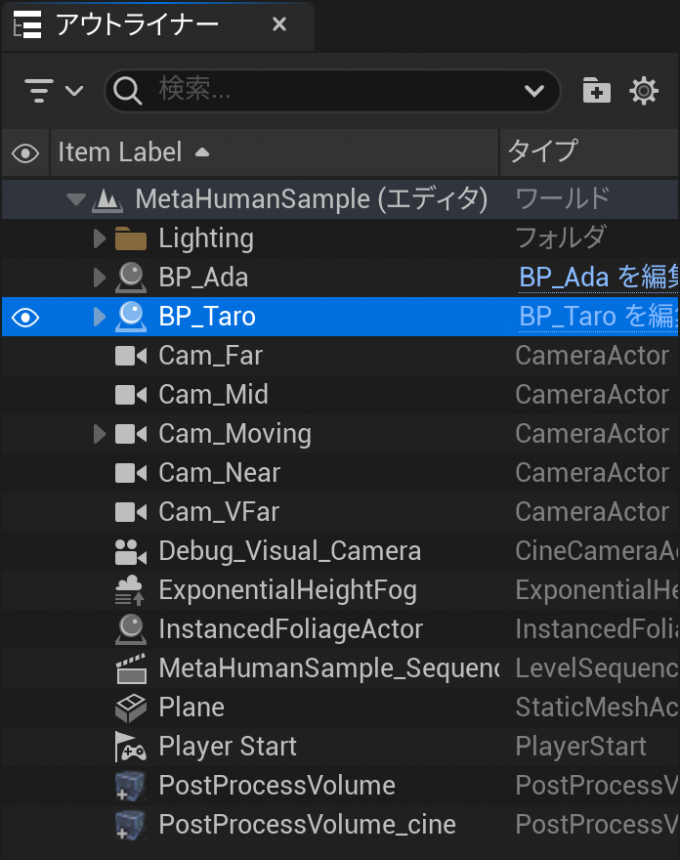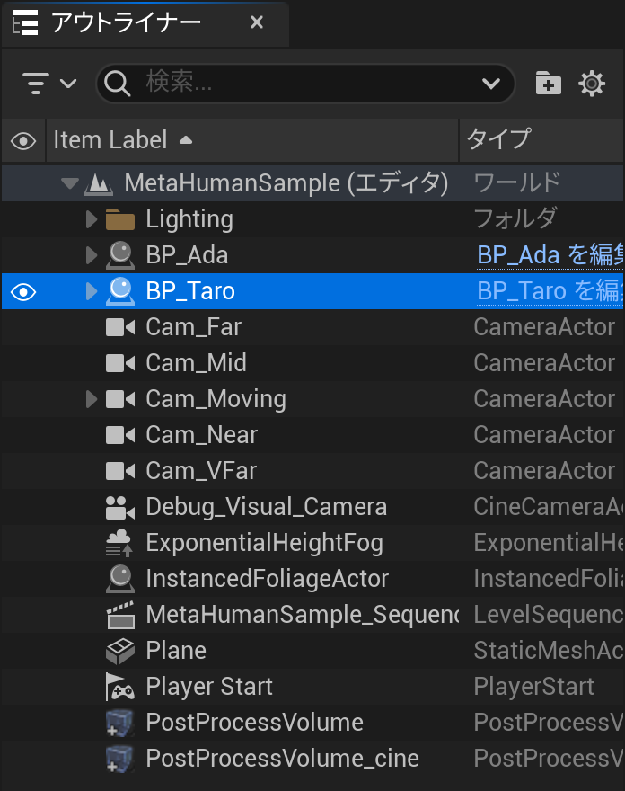 次に「アウトライナー」タブの中からキャラクターを選択します。サンプルプロジェクトのMetaHumansでは2人のキャラがいますが、ここでは例として日本人男性キャラの「BP_Taro」をクリックします。