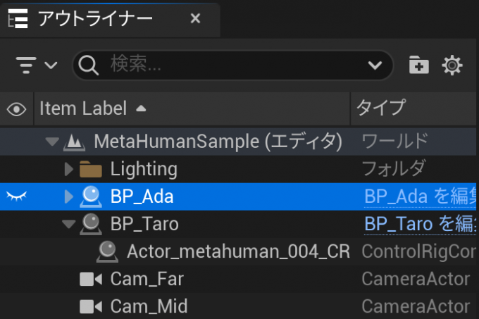 最後にもう一人のキャラを画面から消します。「アウトライナー」タブの「BP_Ada」を選択し、行の左端の目玉をクリックして閉じるアイコンにするとエディタ内に表示されなくなります。