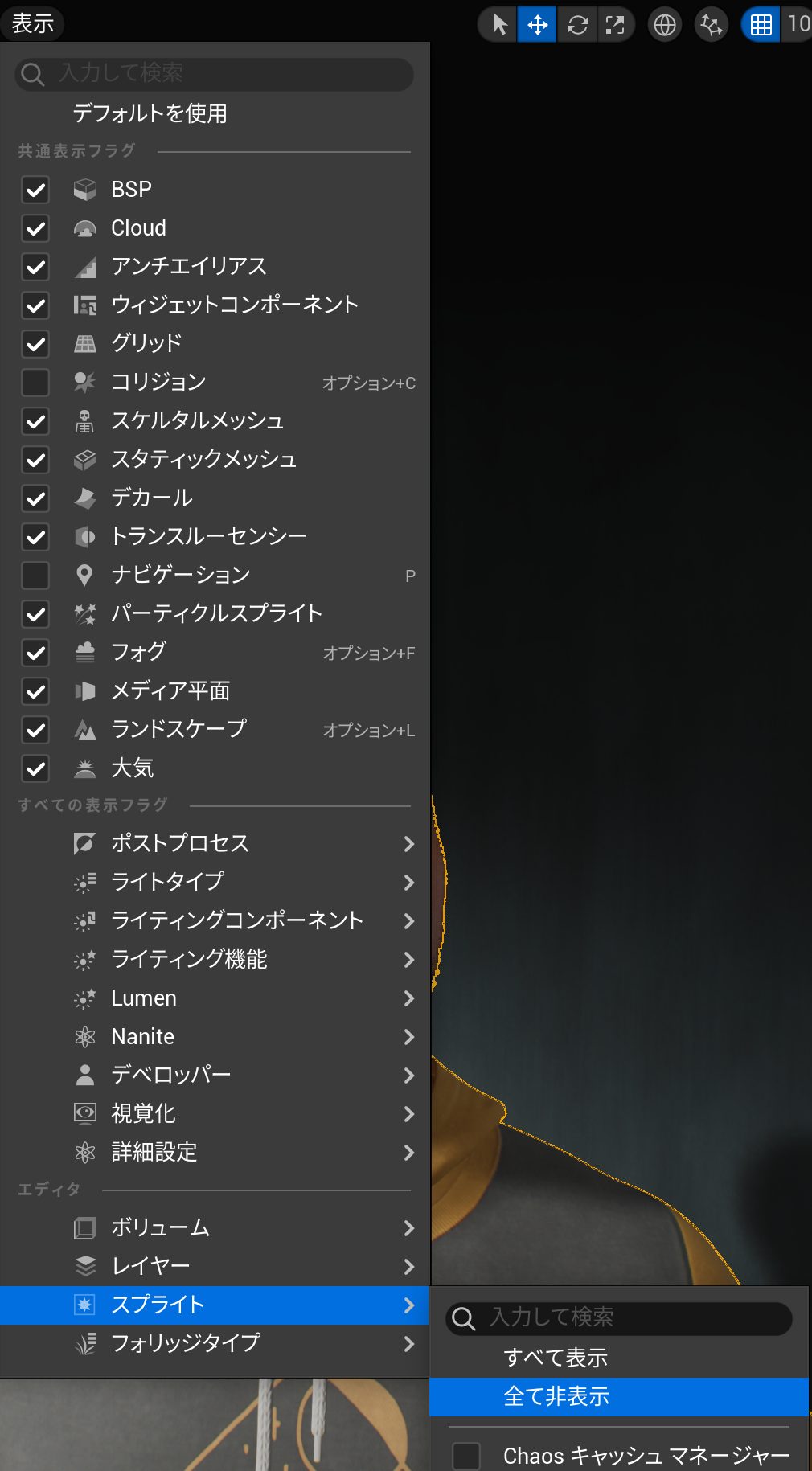 先にも述べたように、Unreal Engine 5.4.1の髪の毛のレンダリングにバグがあるので非表示にします。誰かが対処法を見つけてくれるでしょう。髪の毛だけを非表示にするには、「アウトライナー」タブで「BP_Taro」を選択した状態で「詳細」タブで「Hair」を選択し、「レンダリング」の「Visible」のチェックをオフにします。