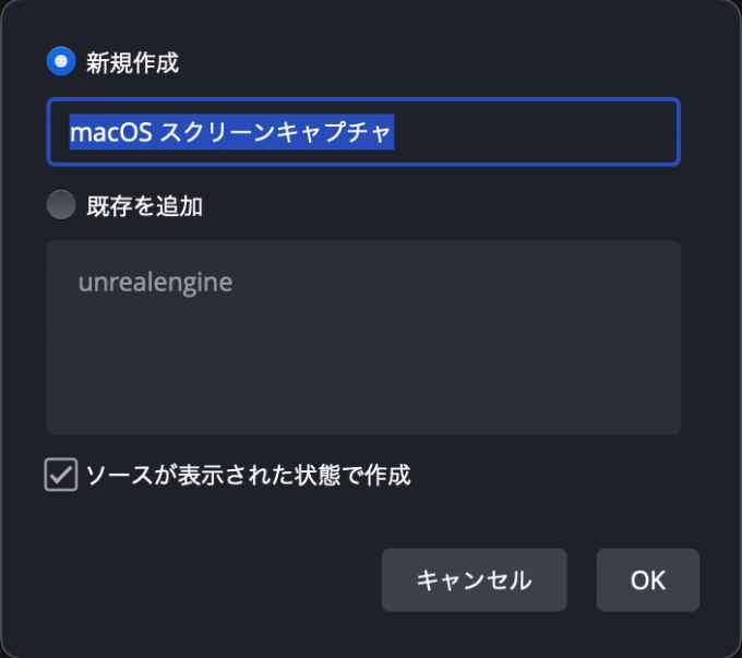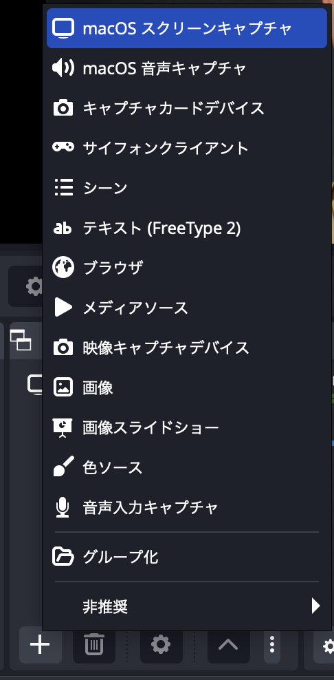 OBS Studioを起動し「ソース」に「macOS スクリーンキャプチャ」を追加します。