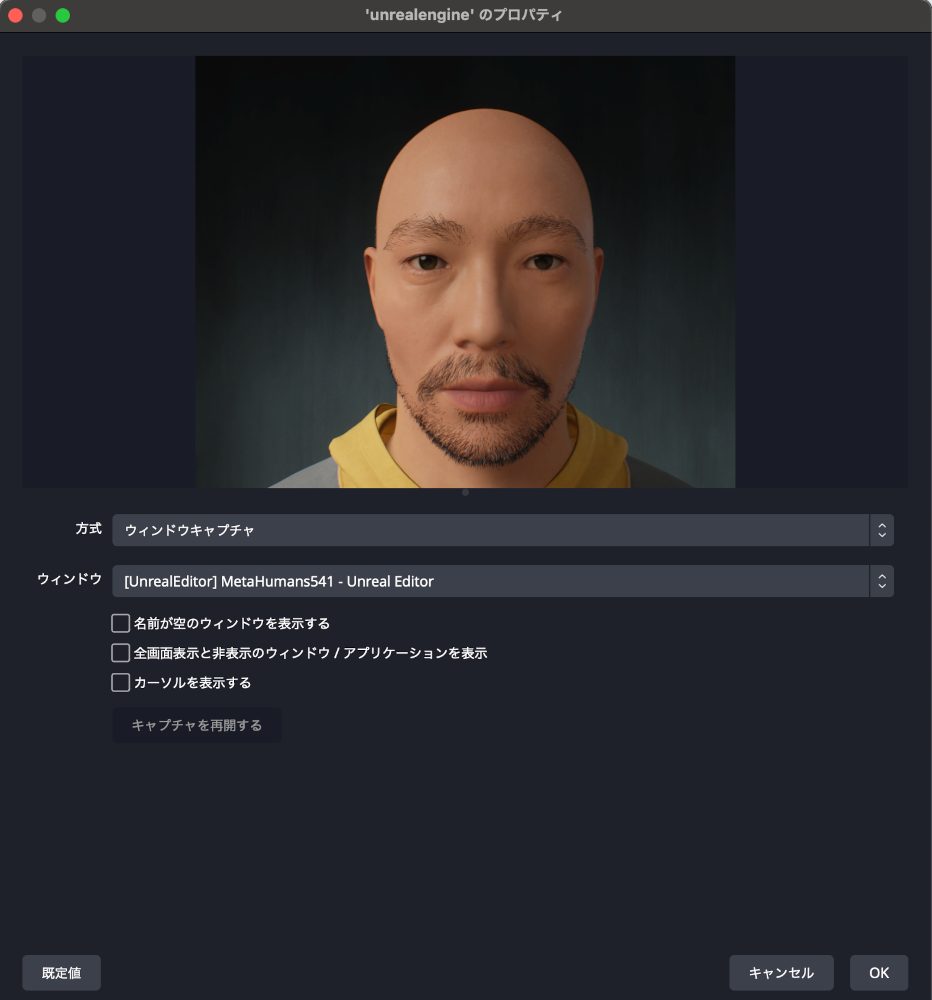 次に出てきたダイアログで「方式」を「ウインドウキャプチャ」、「ウインドウ」をUnreal Editorのプロジェクト名を選択します。「カーソルを表示する」のチェックをはずします。OKボタンを押しダイアログを閉じます。