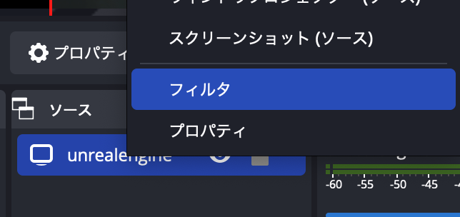 次に追加されたソース「unrealengine」を右クリックし、下から2番目の「フィルタ」をクリックします。