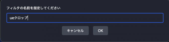 「エフェクトフィルタ」の右下にある「+」ボタンをクリックし、「クロップ/パッド」をクリックし、出てきたダイアログに何かしらの名前を入力します。例えば「ueクロップ」とします。