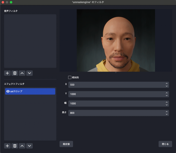 次にunreal engineのエディターウインドウのうち不要部分をカットします。まず「相対的」のチェックのオンオフを決めます。「相対的」というのはウインドウの端からどれだけ内側にクロップ(切り捨て)するかのピクセル数を指します。「相対的」をオフにした場合はウインドウの左上からの起点(X,Y)、大きさ(幅、高さ)を指定します。unreal engineのウインドウの使い方に合わせてお好みで選択してください。ここでは例として「相対的」のチェックをはずします。X,Y,幅,高さをいい感じの数字に指定します。