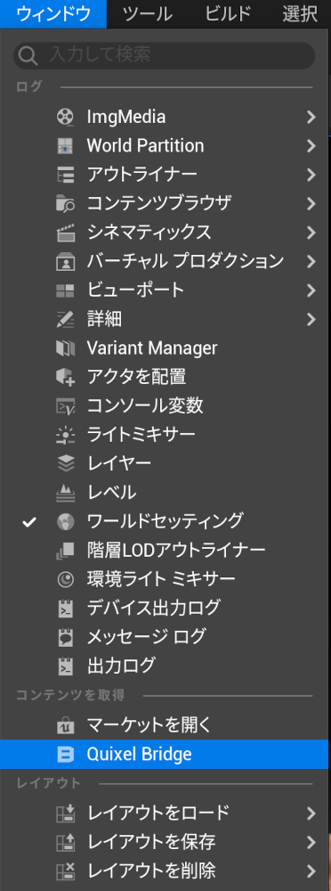 Unreal Engineのメニューから「ウインドウ」-「Quixel Bridge」をクリックします。