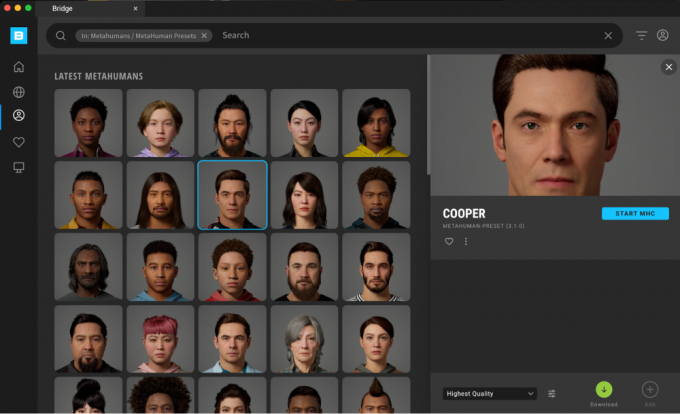 出てきたダイアログの左端のアイコン群の中から真ん中のアイコンをクリックすると、プリセットのキャラクターが66個出てきます。お好みのものを選択し、「Download」ボタンをクリックして数分から10数分待った後に「Add」ボタンを押すと、そのキャラクターがプロジェクトに追加されます。自作のキャラクターを作りたくなったら、この画面から「START MHC」ボタンを押すと専用のWebサイトに移動します。