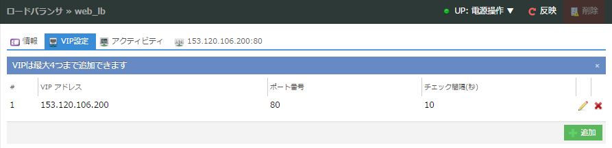 ロードバランサの情報画面が表示されるので、上部の「VIP設定」タブをクリックします。VIPは外部からの接続を受け持つ仮想IPアドレス(Virtual IP address)のことで、このIPアドレスへの接続がロードバランサにより配下の複数のサーバに分散されます。