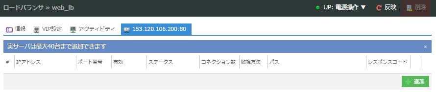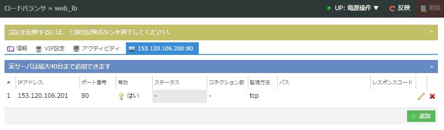 なお、ロードバランサはコントロールパネルでの一連の設定後に実際のロードバランサに設定を投入する仕組みとなっているので、「反映」ボタンをクリックして設定内容を反映させます(まだ起動していない場合は電源操作メニューより「起動」を選択してください)。