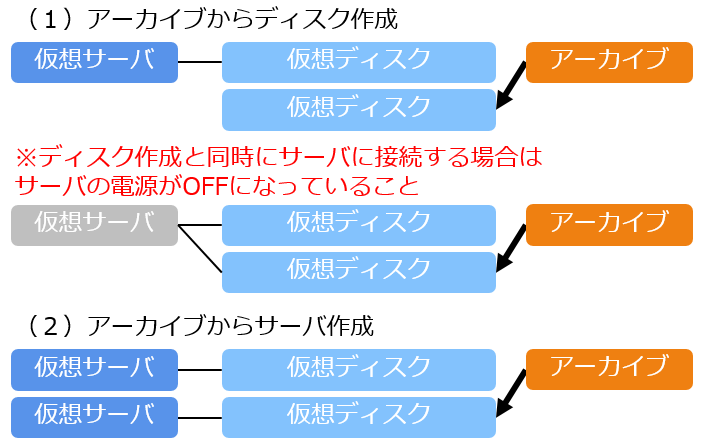 アーカイブは、仮想ディスクからバックアップを作成する機能です。作成したアーカイブからは同じ構成のサーバーを作成することができ、仮想サーバーの複数作成や復旧作業が簡単に行えます。