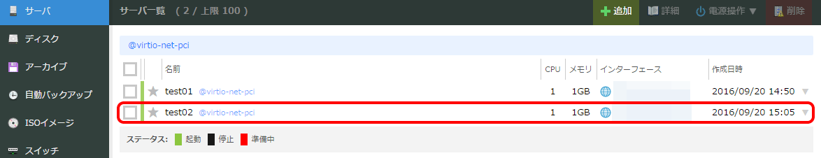 アーカイブ「test01_archive」からtest02サーバを作成しました。一覧画面にサーバが追加されていることを確認します。