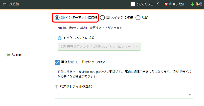 共有セグメントのDHCP機能を利用してインストールを行いますので、「インターネットに接続」を選択します。