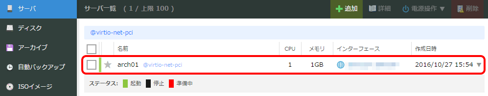 2016年10月の時点では、さくらのクラウドにおいてArch Linuxはパブリックアーカイブとしては提供されておらず、パブリックISOイメージを利用してインストールすることになります。