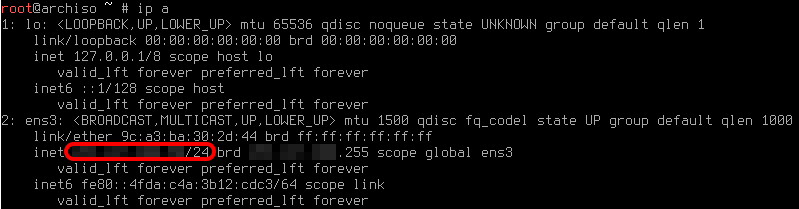 archisoのコンソール画面に遷移しますので、ここで以下のコマンドでIPアドレスを確認してみましょう。