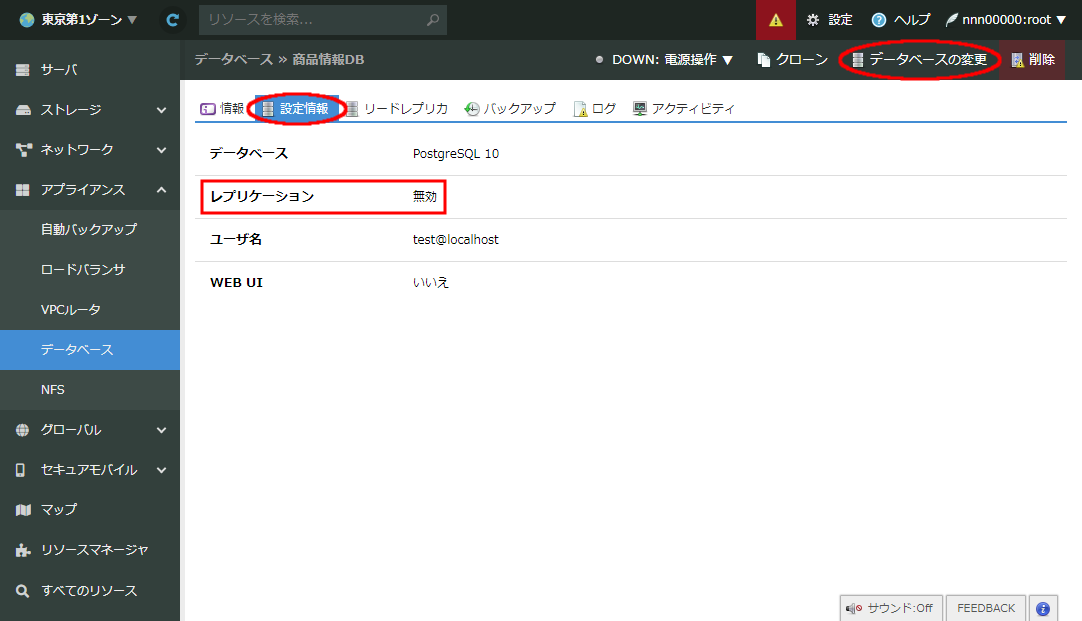 リードレプリカを作成する前に、マスター側となるデータベースアプライアンスにおいてレプリケーションを許可する設定が有効であるかどうかを確認します。