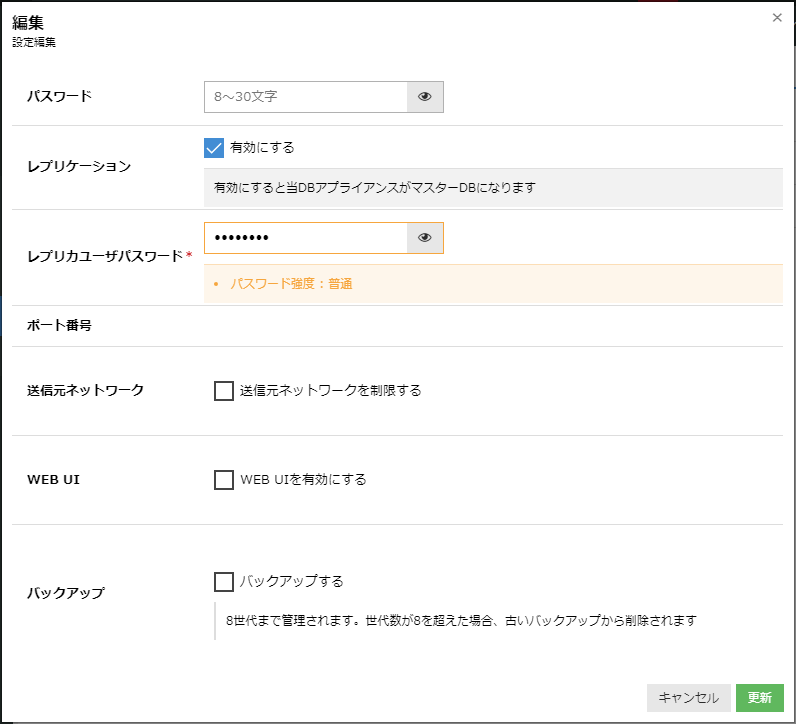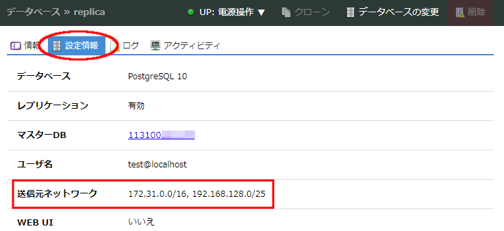 画面上部に表示される「データベースの変更」ボタンでは、レプリカユーザパスワードおよび送信元ネットワークの制限設定を変更することが可能です。