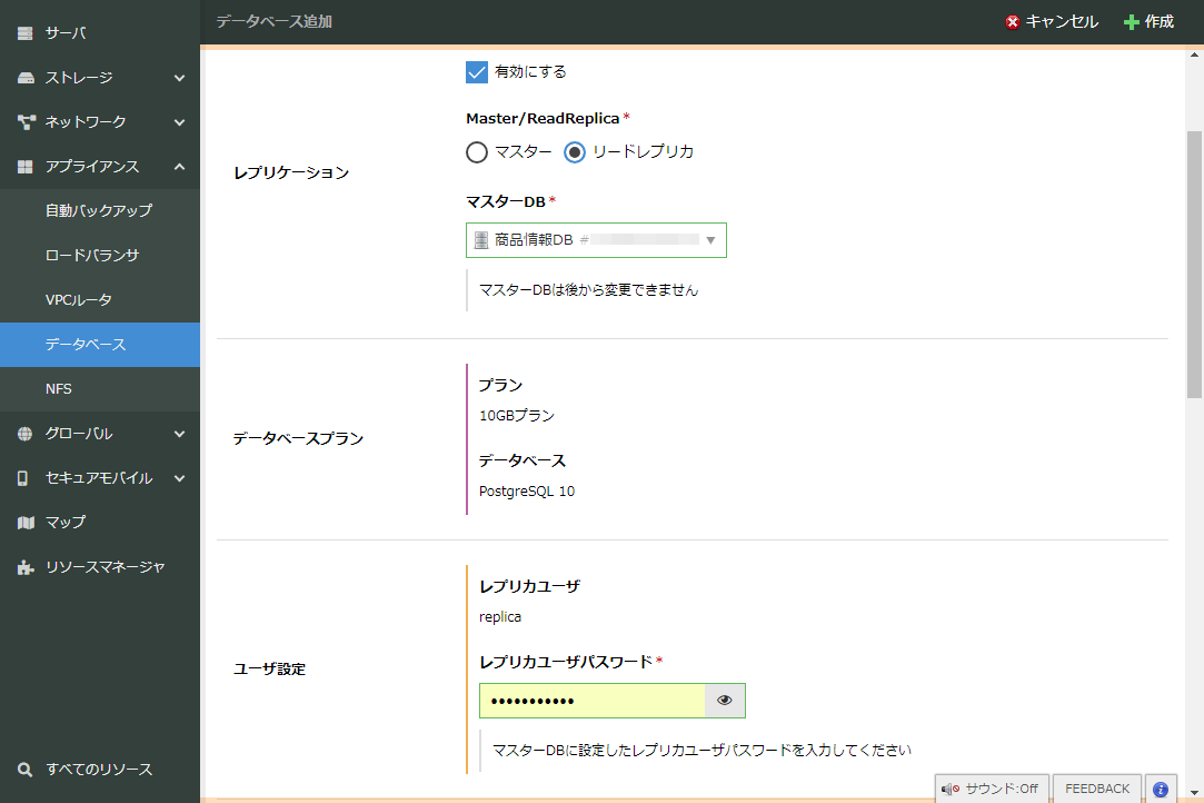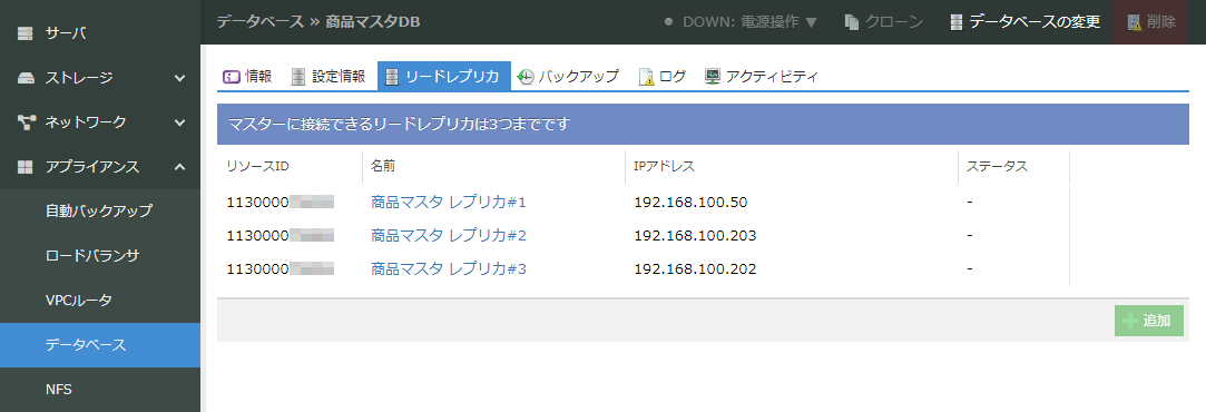 「リードレプリカ」は、アプライアンス「データベース」をマスターとする読み込み専用のデータベースサーバを作成する機能です。