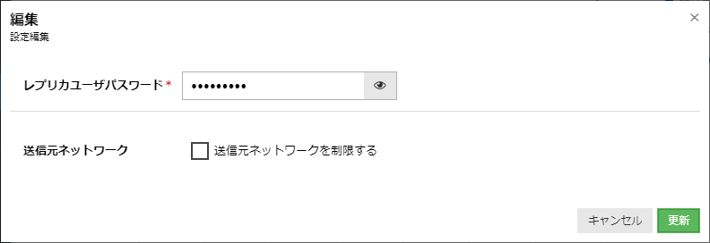 - ユーザ設定の項目にある「レプリカユーザパスワード」にマスター側に接続する際のパスワードを入力します。マスター側でレプリケーションの有効設定を行った際に「レプリカユーザパスワード」に指定したパスワードと同じものを入力します。