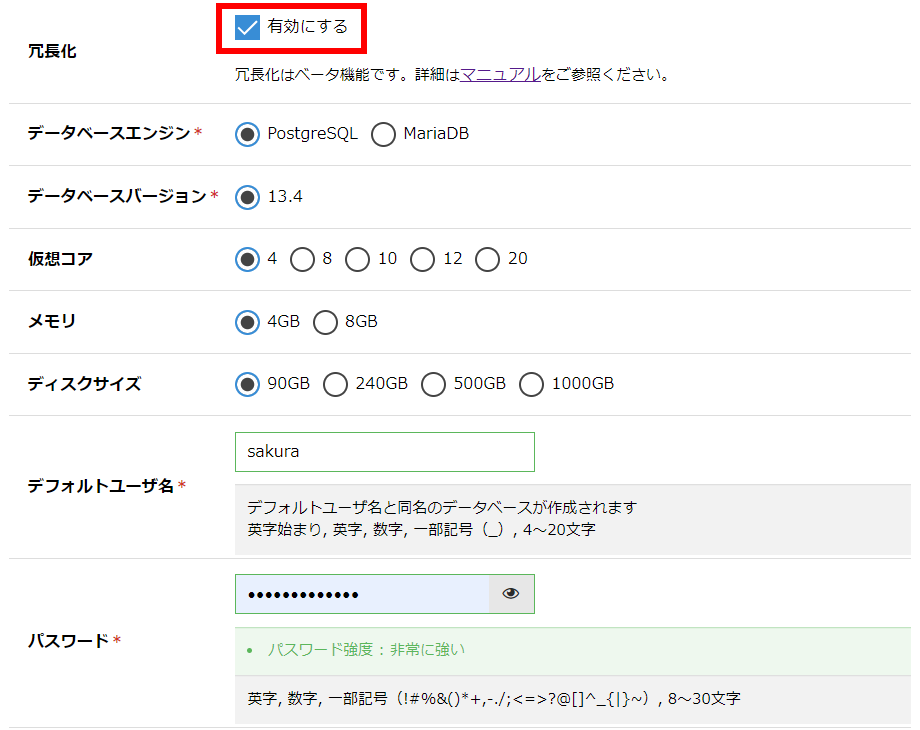 新規作成画面の「冗長化」の項目で「有効にする」にチェックボックスを入れます。また、これにより追加の設定項目が表示されるのでそれぞれ選択・入力します。