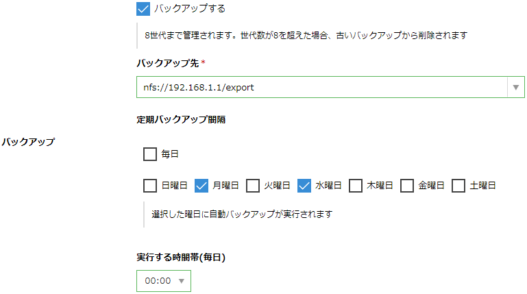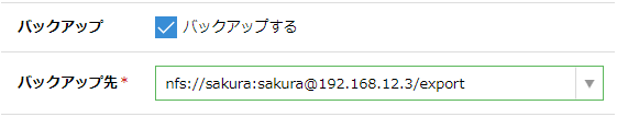 新規作成画面で「バックアップする」のチェックを有効にすると、バックアップ先のNFSを指定するフィールドが表示されます。