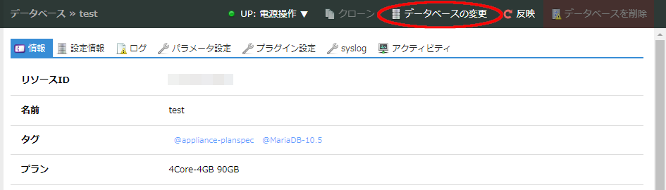 また、作成後のデータベースアプライアンスのバックアップ設定を変更したい場合は上部の「データベースの変更」ボタンをクリックします。