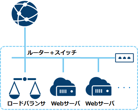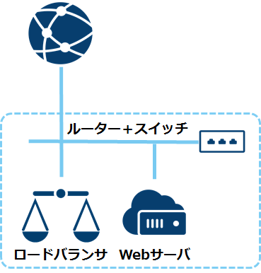「ルータ+スイッチ」を作成し、その配下に1台のロードバランサと1台のウェブサーバが接続されています。