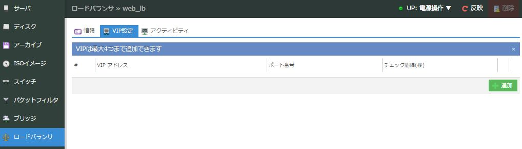 ロードバランサの情報画面が表示されるので、上部の「VIP設定」タブをクリックします。VIPは外部からの接続を受け持つ仮想IPアドレス(Virtual IP address)のことで、このIPアドレスへの接続がロードバランサにより配下の複数のサーバに分散されます。