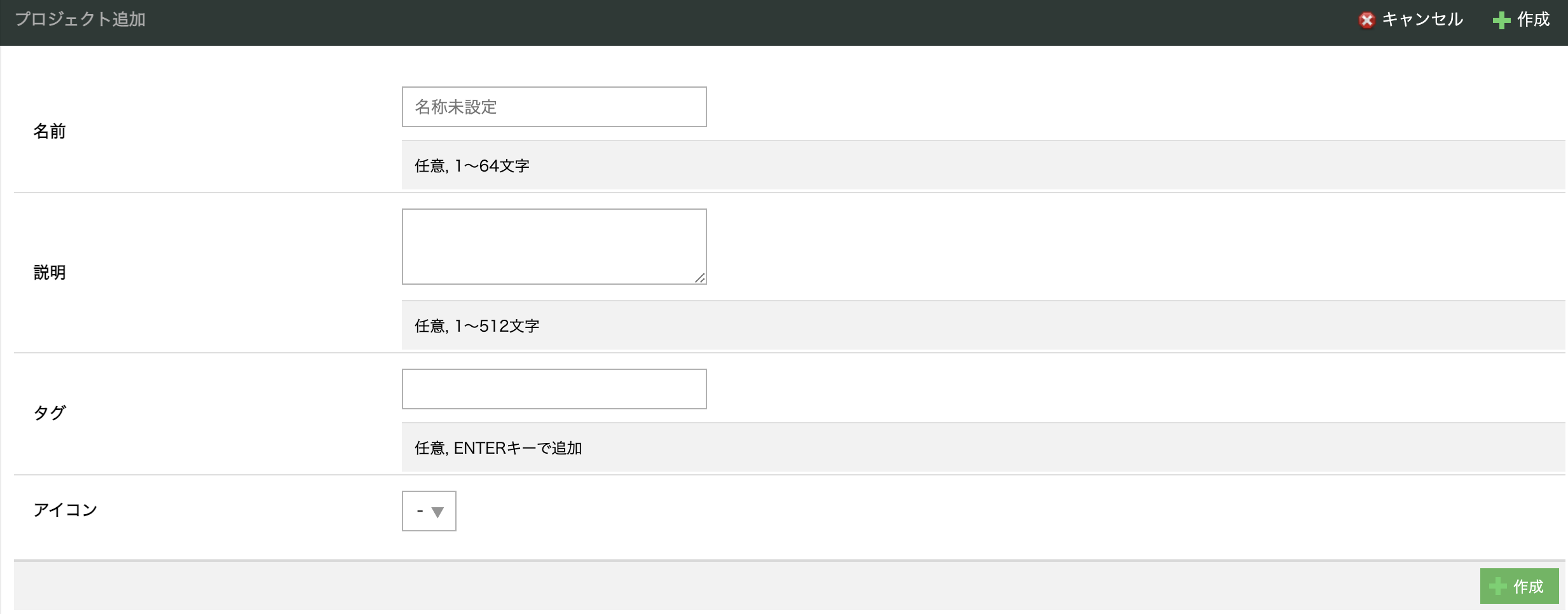作成時の設定を入力し、「作成」ボタンをクリックするとプロジェクトを作成できます。なお、作成時に指定した名前などの各項目は、作成後も変更可能です。