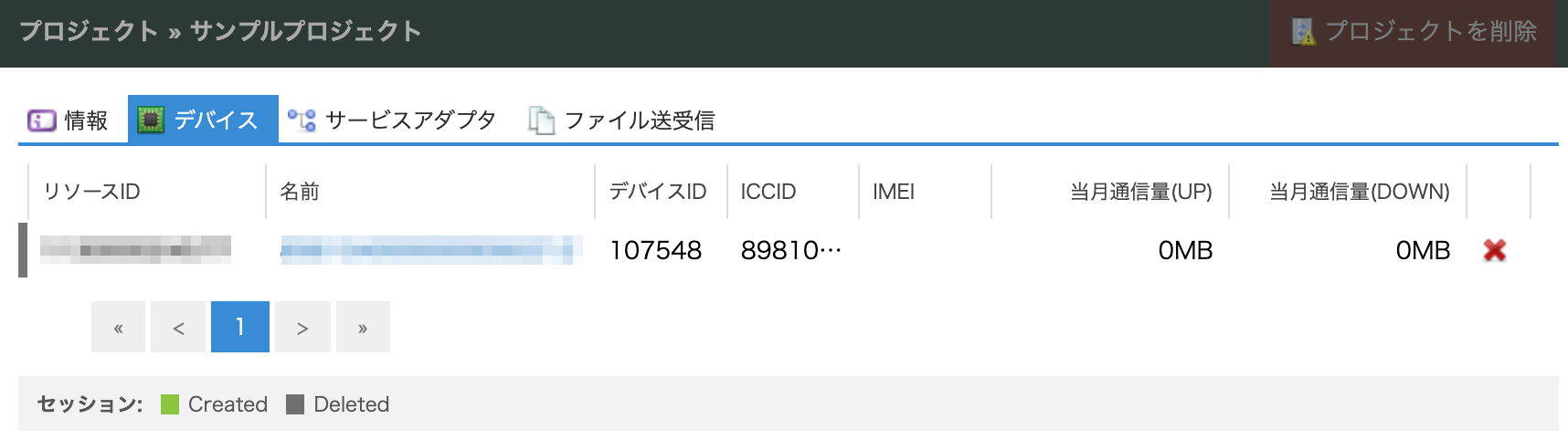 作成したプロジェクトを削除する場合は事前に登録したデバイスとサービスアダプタの削除が必要です。 「デバイス」タブをクリックして表示されるデバイス一覧画面から、リスト右側の削除ボタンをクリックし全てのデバイスを削除します。