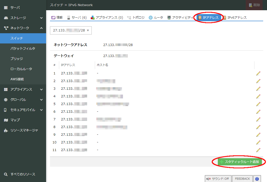 上部に表示されるタブから「IPアドレス」をクリックすると、選択したルータ+スイッチに割り当てられているIPアドレス一覧が表示されます。新たにスタティックルート機能で割り当てるIPアドレスブロックを追加する場合は、画面右下の「スタティックルート追加」ボタンをクリックします。